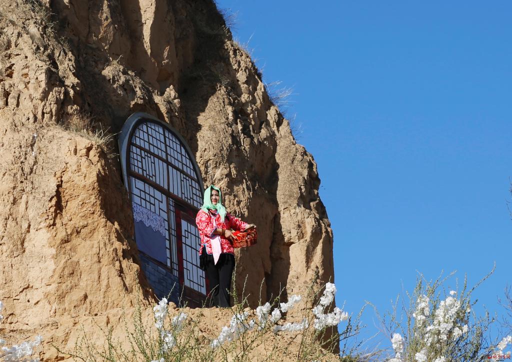 有愛美的阿姨帶著艷麗的絲巾在花間起舞