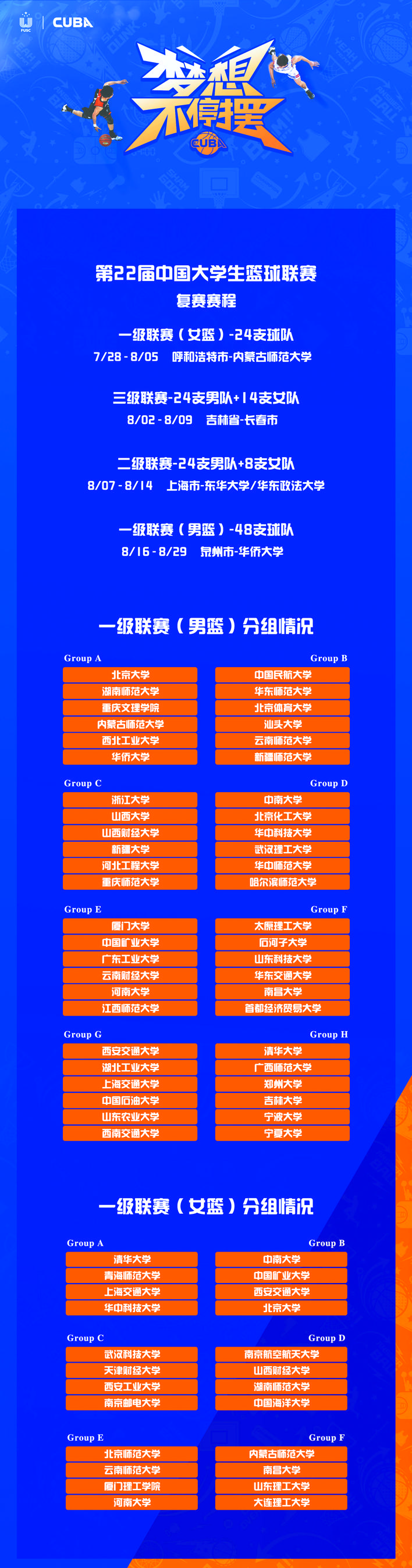 新華社北京7月14日電(記者李博聞、王鏡宇)7月28日起,第22屆CUBA(中國大學生籃球聯(lián)賽)剩余比賽將以賽會制形式分別在內(nèi)蒙古師范大學、東華大學、華東政法大學、華僑大學和吉林省長春市等地空場進行。CUBA聯(lián)賽組委會對復賽后的賽程進行了精簡。