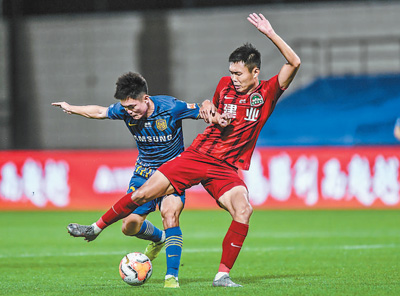 7月26日,河南建業(yè)隊(duì)球員王上源(右)在比賽中拼搶。當(dāng)日,在2020賽季中超聯(lián)賽(大連賽區(qū))第一輪比賽中,江蘇蘇寧易購(gòu)隊(duì)以4∶3戰(zhàn)勝河南建業(yè)隊(duì)。新華社記者 潘昱龍攝