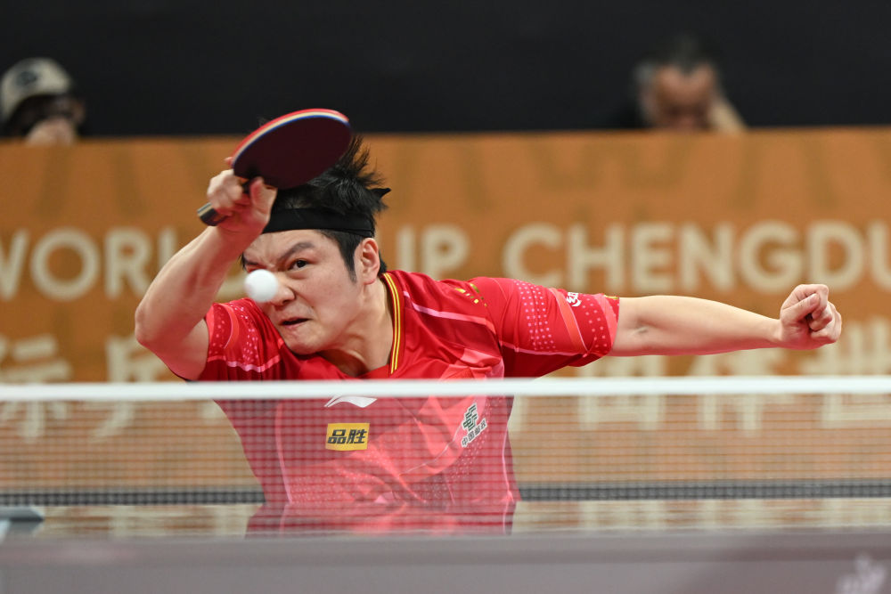 12月7日,中國(guó)隊(duì)選手樊振東在男單比賽中回球。新華社記者 胥冰潔 攝