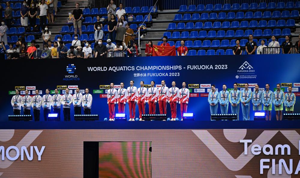 7月21日,在日本福岡舉行的2023年世界游泳錦標(biāo)賽花樣游泳集體自由自選決賽中,中國隊以329.1687分的成績獲得冠軍。新華社記者 夏一方 攝