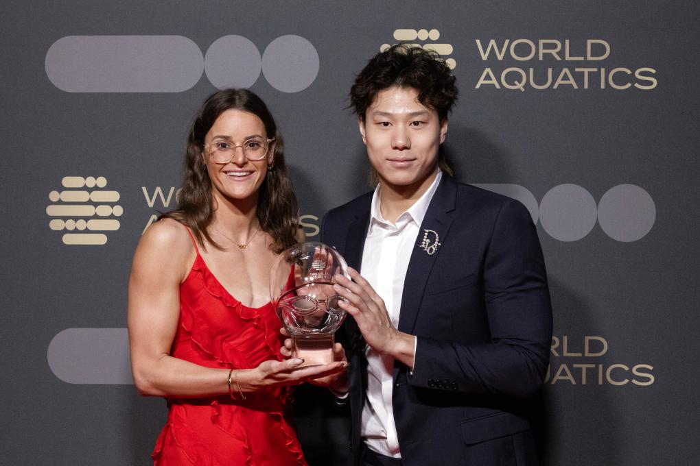 10月23日,在匈牙利布達(dá)佩斯,中國選手覃海洋獲選世界泳聯(lián)年度最佳男子游泳運動員,澳大利亞選手麥基翁獲選最佳女子游泳運動員。新華社發(fā)(弗爾季·奧蒂洛攝)
