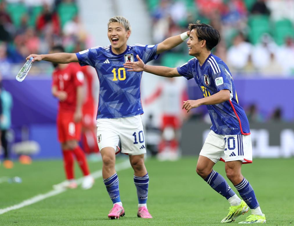 1月31日,日本隊(duì)球員久保建英(右)與堂安律慶祝進(jìn)球。新華社記者 賈浩成 攝
