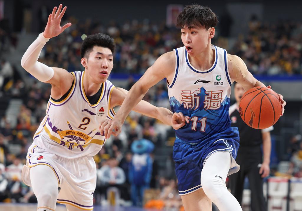 3月10日,新疆隊球員齊麟(右)帶球突破北控隊球員廖三寧的防守。新華社記者 胡虎虎 攝