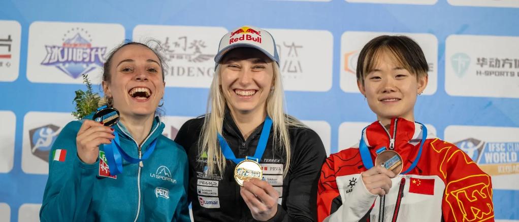 女子攀石冠軍加恩布雷特(中)、亞軍莫羅尼(左)和季軍駱知鷺(右)在領(lǐng)獎(jiǎng)臺(tái)上合影。圖片來(lái)自國(guó)際攀聯(lián)官網(wǎng)