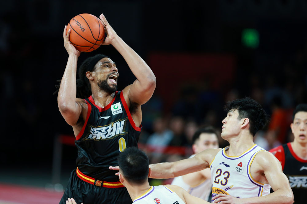 4月15日,深圳隊(duì)球員薩林杰(左)在比賽中伺機(jī)進(jìn)攻。新華社發(fā)(彭志剛攝)