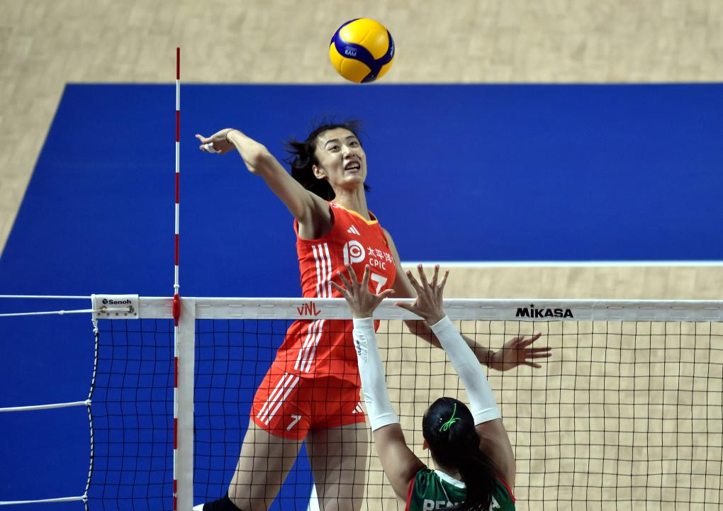 6月11日,中國隊球員朱婷(中上)在比賽中進攻。新華社記者 朱煒 攝