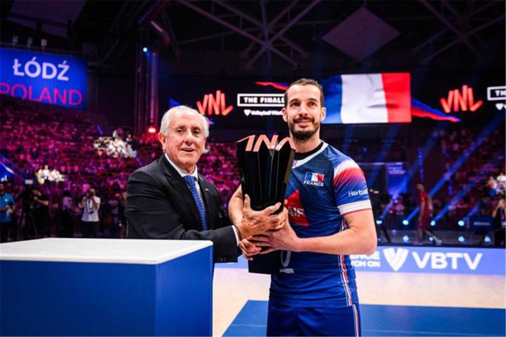 法國排球國家隊(duì)隊(duì)長本杰明·托紐蒂上臺領(lǐng)取獎杯,圖片來自FIVB國際排聯(lián)官網(wǎng)。