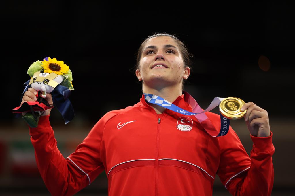 2021年8月7日,獲得冠軍的土耳其選手蘇梅內(nèi)利在領(lǐng)獎(jiǎng)臺(tái)上。當(dāng)日,東京奧運(yùn)會(huì)拳擊女子69公斤級(jí)頒獎(jiǎng)儀式舉行。新華社記者 歐東衢 攝