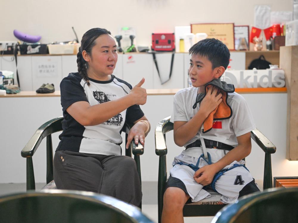 7月16日,方先旻的媽媽在訓(xùn)練間隙鼓勵(lì)孩子。新華社記者 王曦 攝