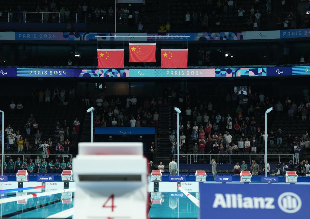 9月7日,巴黎殘奧會(huì)女子200米個(gè)人混合泳SM5級(jí)頒獎(jiǎng)儀式現(xiàn)場(chǎng)升起三面五星紅旗。該項(xiàng)目中,中國(guó)選手何聖羔、盧冬、成姣包攬冠亞季軍。新華社記者 高靜 攝
