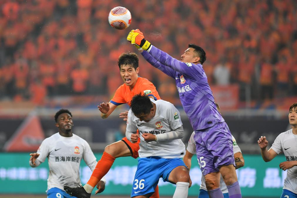 9月13日,青島西海岸隊(duì)守門員石笑天(右二)在比賽中防守。新華社記者 朱崢 攝