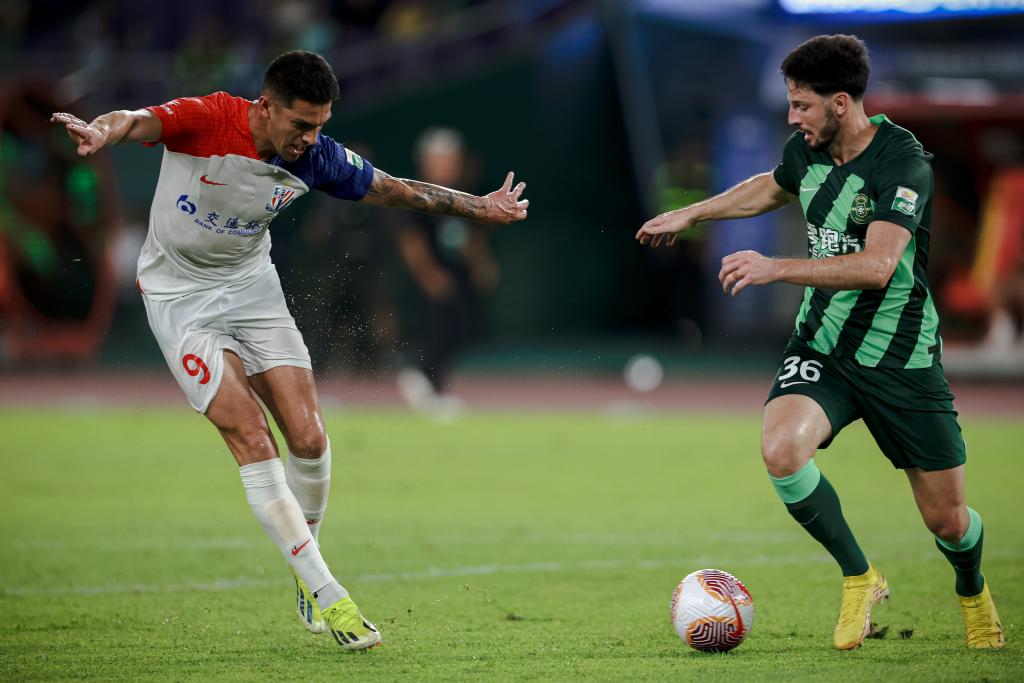 9月13日,上海申花隊(duì)球員安德烈·路易斯(左)在比賽中射門得分。新華社記者 江漢 攝