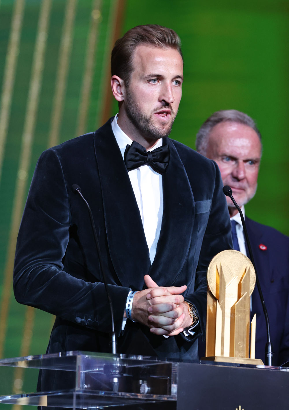 10月28日,英格蘭球員凱恩在頒獎(jiǎng)典禮上發(fā)言,他與法國(guó)球員姆巴佩共同獲得獲得象征最佳前鋒的“蓋德·穆勒獎(jiǎng)”。新華社記者 高靜 攝