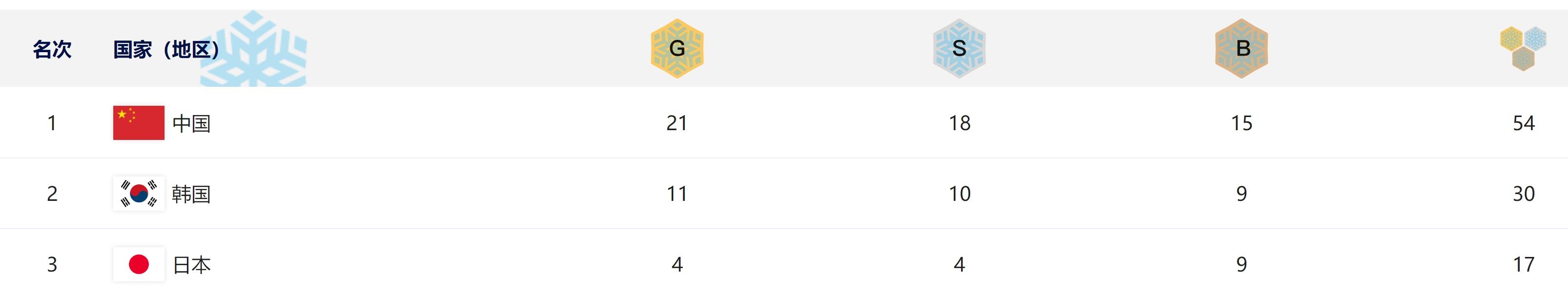 單日再奪6金,中國代表團(tuán)在本屆亞冬會(huì)已奪得21金18銀15銅,21金也創(chuàng)造了中國代表團(tuán)參加單屆亞冬會(huì)歷史最佳成績(此前為2007年長春亞冬會(huì)的19金)。韓國隊(duì)目前以11金10銀9銅排名獎(jiǎng)牌榜第二,日本隊(duì)以4金4銀9銅排名第三。