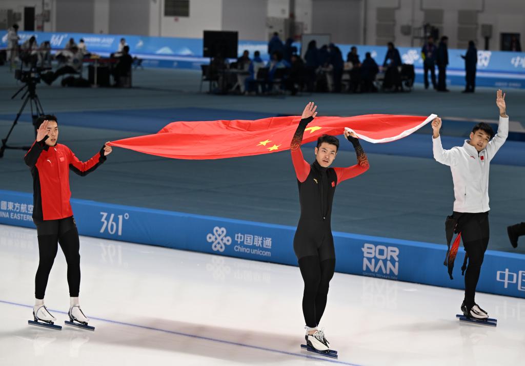 黑龍江省冰上訓(xùn)練中心速滑館里,《義勇軍進(jìn)行曲》三度奏響。當(dāng)日速度滑冰全部3枚金牌均被中國隊(duì)收入囊中。高亭宇先以0.02秒的微弱優(yōu)勢力壓日本選手森重航,奪得男子500米冠軍;又與隊(duì)友廉子文、寧忠?guī)r合作,奪得男子短距離團(tuán)體追逐金牌。女隊(duì)則又一次讓三面五星紅旗同時(shí)升起,楊濱瑜、韓梅、太智恩分獲女子3000米前三名。本屆亞冬會(huì)有三金入賬的高亭宇坦言不知道這會(huì)不會(huì)是自己最后一屆亞冬會(huì),“(這次)我的關(guān)鍵詞是努力,相信大家一起努力,中國速度滑冰會(huì)越來越好”。
