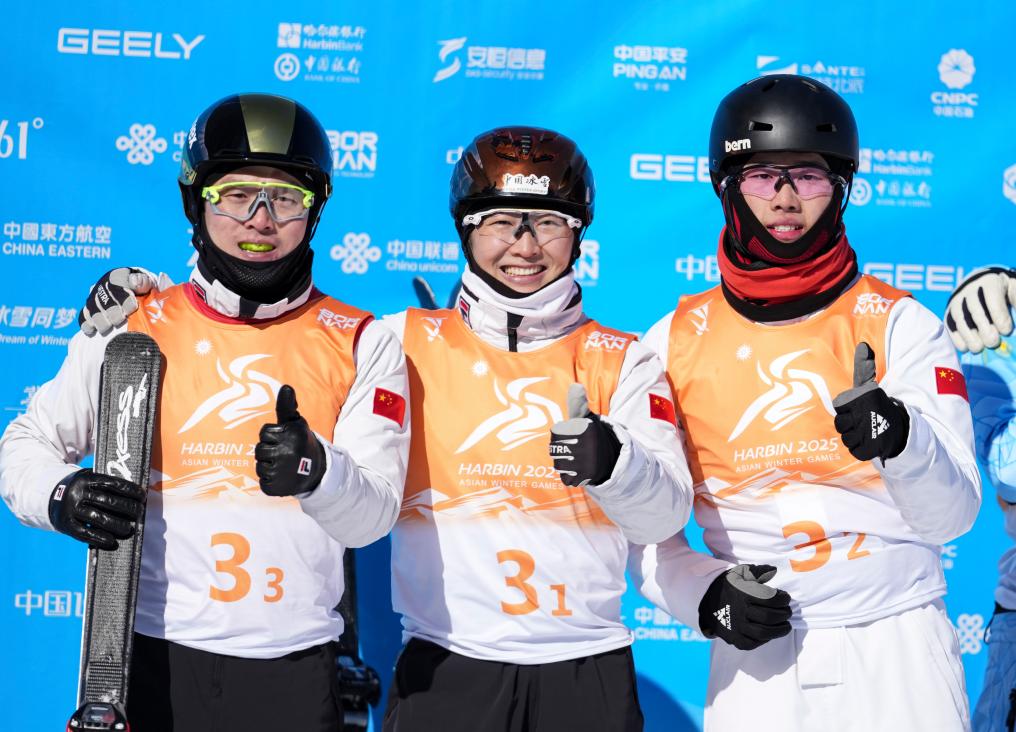 2月10日,齊廣璞、徐夢桃和李心鵬(從左至右)在賽后合影。當(dāng)日,在亞布力舉行的第九屆亞冬會(huì)自由式滑雪空中技巧混合團(tuán)體決賽中,中國隊(duì)奪冠。新華社記者 賴向東 攝