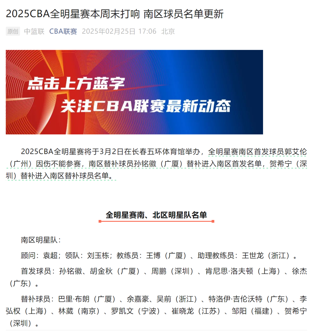 新華社北京2月25日電 中國男子籃球職業(yè)聯(lián)賽(CBA)25日宣布,全明星賽南區(qū)首發(fā)球員郭艾倫因傷不能參賽,南區(qū)替補(bǔ)球員孫銘徽替補(bǔ)進(jìn)入南區(qū)首發(fā)名單。