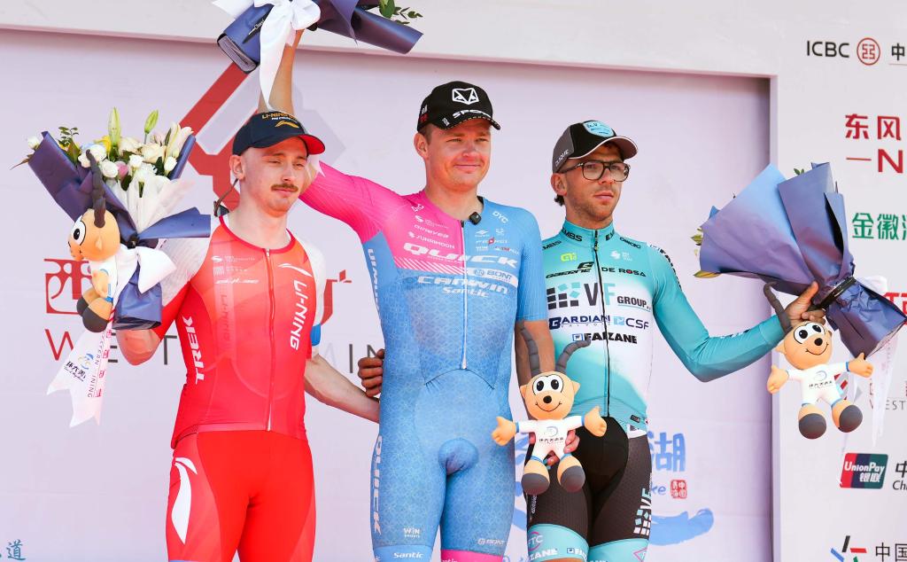 7月9日,賽段冠軍愛沙尼亞快客車隊(duì)車手拉亞斯·馬?。ㄖ校?、亞軍李寧之星車隊(duì)車手謝爾比·亞歷山大(左)、季軍意大利巴迪亞尼車隊(duì)車手扎農(nóng)塞洛·恩洛科在領(lǐng)獎(jiǎng)臺上合影。新華社記者 齊芷玥 攝