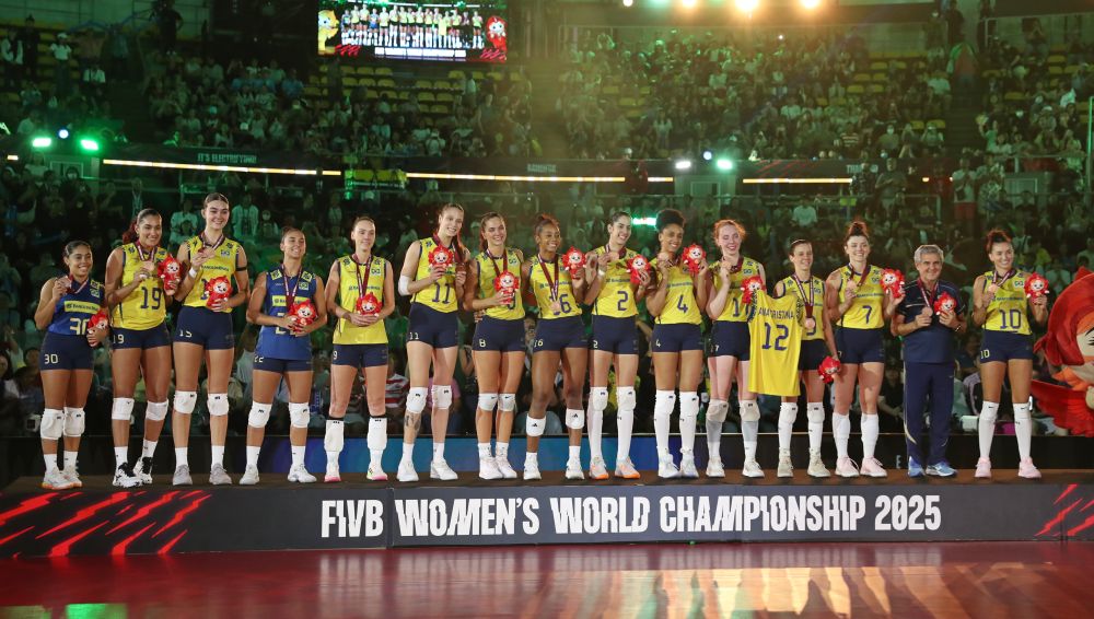 9月7日,巴西隊(duì)在頒獎(jiǎng)儀式上。新華社記者 孫瑋彤 攝
