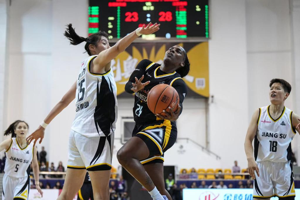 首節(jié)兩隊進攻成功率都不高,本節(jié)結(jié)束時江蘇隊以16:13領(lǐng)先。孫宇成為江蘇隊在第二節(jié)中的“奇兵”,她單節(jié)得到11分,東莞隊則依靠卡多佐的內(nèi)線優(yōu)勢保持著比分上的均勢。上半場結(jié)束,東莞隊落后3分。
