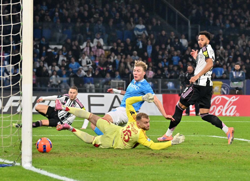 那不勒斯開(kāi)場(chǎng)不久就有所斬獲。第七分鐘,霍伊倫接隊(duì)友內(nèi)雷斯的橫傳,近距離包抄破門(mén)。此后兩隊(duì)你來(lái)我往,上半時(shí)接近尾聲時(shí),尤文球員凱利將絕佳機(jī)會(huì)球踢飛,而主隊(duì)麥克托米納的頭球也被立柱拒絕。