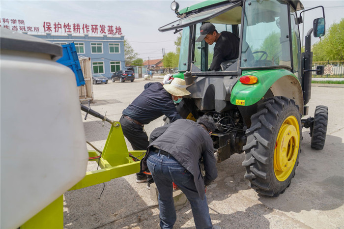 △在吉林省四平市梨樹縣康達農機農民專業(yè)合作社,農民在調試免耕播種機。