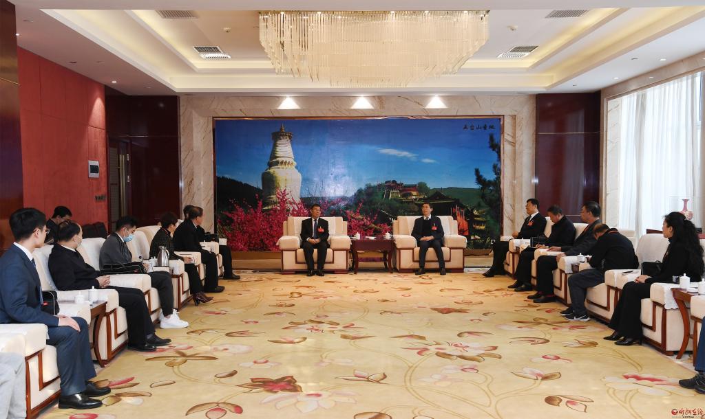 郭奔勝、王建廷看望慰問(wèn)參加市政協(xié)四屆六次會(huì)議報(bào)道的記者。馮曉磊 攝