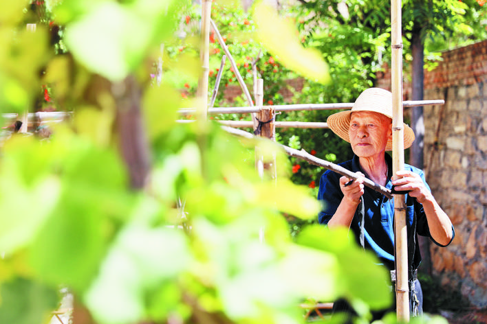 6月1日,河北省平山縣西柏坡鎮(zhèn)北莊村村民在為菜園搭架。