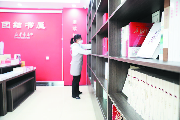 6月1日,河北省平山縣西柏坡鎮(zhèn)北莊村團(tuán)結(jié)書屋的工作人員在整理書籍。