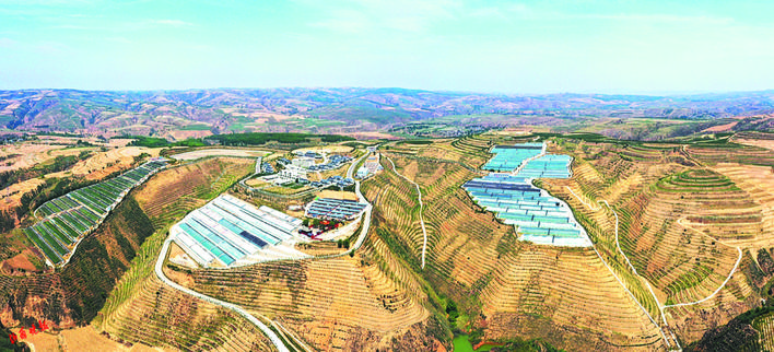 站在村對(duì)面的山梁上望去,黃土高原茫茫群山之中,榆嶺窊顯得特別扎眼。小別墅和小高樓自不必說,梯田層層疊疊,像波浪涌動(dòng),延伸到山腳,占了好幾道山梁溝岔。梯田之上的丘嶺上,大棚齊齊整整,在陽光下熠熠生輝。