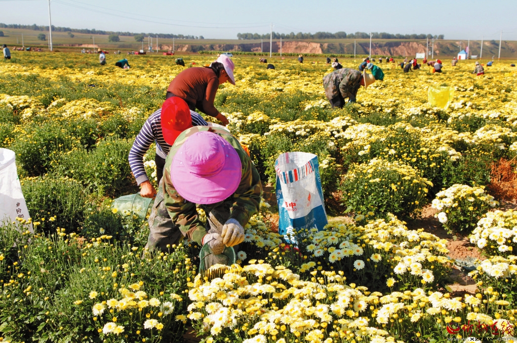 五寨縣中藥材種植基地的菊花進(jìn)入盛花期,農(nóng)民們忙著采收、晾曬,供應(yīng)市場。 劉篤效攝