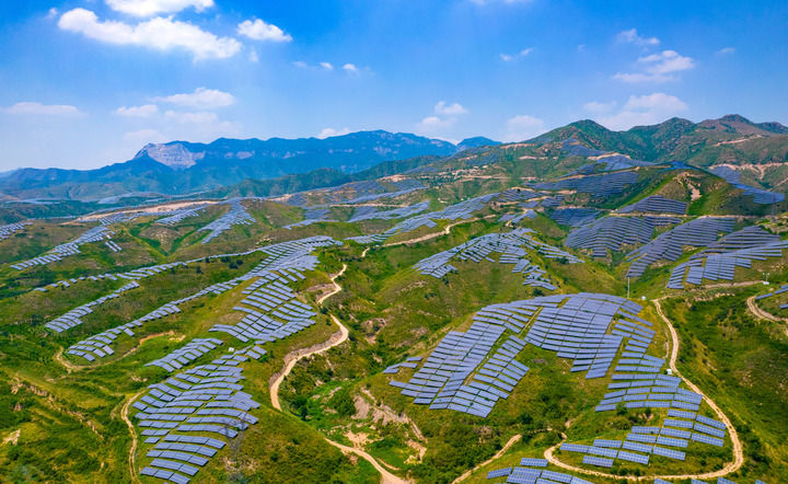 2023年7月18日,在山西省運(yùn)城市稷山縣100MW光儲(chǔ)一體化項(xiàng)目基地,一排排整齊的光伏板與遠(yuǎn)處的青山交相輝映。近年來(lái),稷山縣因地制宜流轉(zhuǎn)荒山荒坡發(fā)展光伏產(chǎn)業(yè),增加農(nóng)民收入,助力鄉(xiāng)村振興。(山西省委辦公廳 供圖)