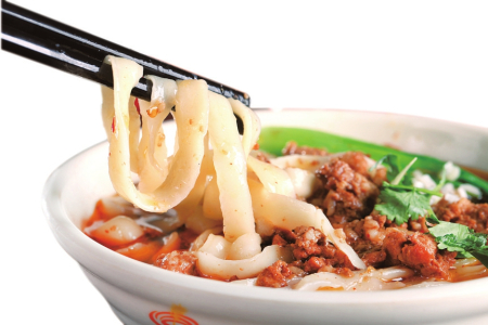 在開始削面之前,非常重要的步驟就是和面和醒面。和面的面和水需要按照一定的比例,同時(shí)對(duì)水溫也有一定的要求,冬天要用熱水,夏天要用涼水,春秋要用溫水。和好面之后緊接著就是醒面,需要用濕布蓋住面團(tuán)醒20分鐘左右。如果說(shuō)吃刀削面是飽了口福,那么看刀削面下鍋可稱之為飽了眼福。一只手托著放著面團(tuán)的案板,另一只手拿著削面刀,削面刀又分為片刀和勾刀,削面時(shí),出力要平,用力要均,削出的面條中間厚兩邊薄,一葉連著一葉,在空中劃出一道道弧形白線,落入鍋中的面條好似一條條銀魚,隨著熱水的翻滾不斷舞動(dòng)。有順口溜贊曰:“一葉落鍋一葉飄,一葉離面又出刀,銀魚落水翻白浪,柳葉乘風(fēng)下樹梢?!?/p>